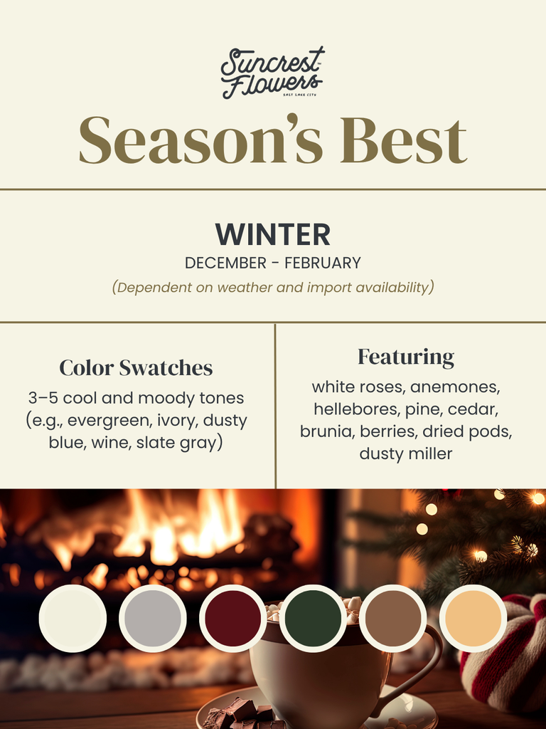 Winter: evergreens, deep tones, texture-heavy